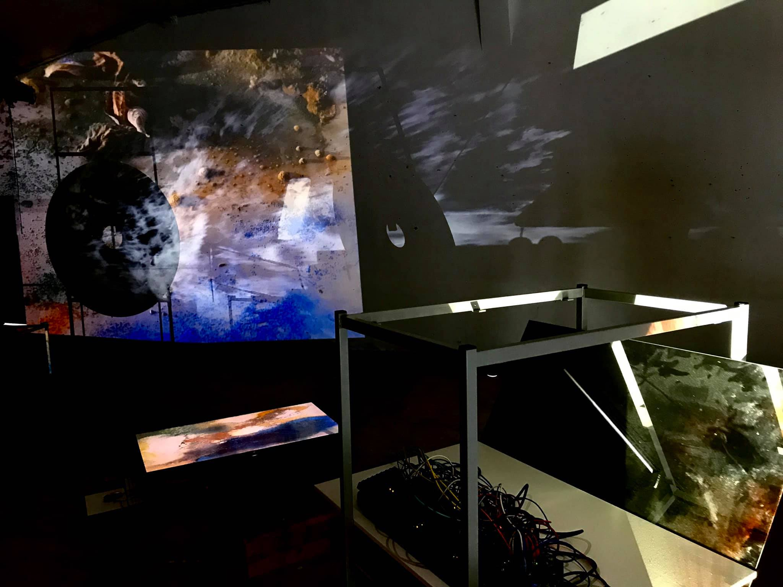 This footage ended up being used as part of the performances, which included several films, live streams, and projections covering the walls and various objects scattered through the space. The turbulence of the water became an important point of reference for the sound, as my instrument conjured up sonic turbulence. In a curiously cybernetic sense, the destructive, entropic process of the waterfall became one of the creative motifs that were enmeshed into a more complex, multilayered art installation.