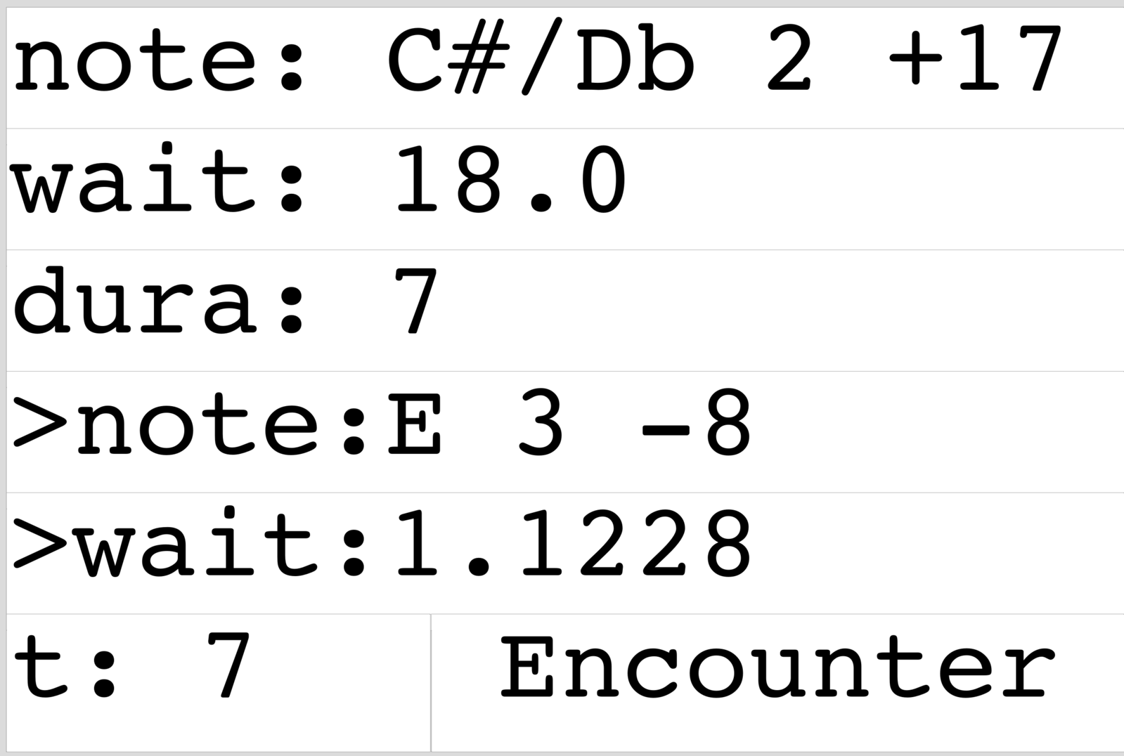 Information - current and upcoming notes and wait times - and instructions - Encounter - generated algorithmically by SuperCollider as part of my piece, Follow the Unfolding.