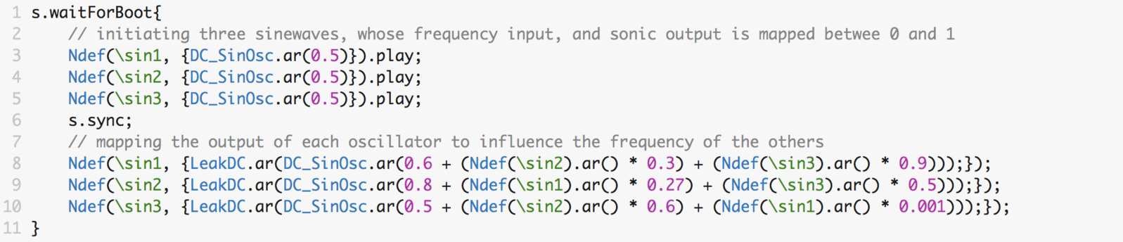 An early sketch in SuperCollider investigating three cross modulating sine wave oscillators through live coding.