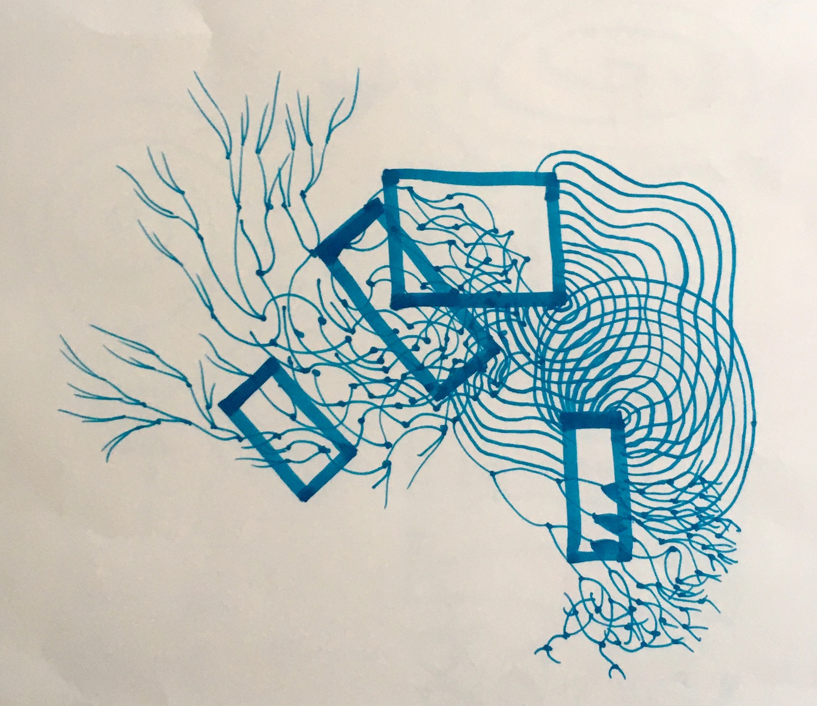 The illustration above was made during a workshop at BEK, The Bergen Center for Electronic Art. At the start of the workshop, the participants, myself included, were challenged to draw a schematic, illustrating how our practices were organized. The drawing captured a wide scope of ongoing processes, some overlapping and forming patterns of ripples. The square boxes function as frames, focusing attention to certain areas where the interferences add up together, becoming something more than its parts. The workshop took place while one of my instruments was in the midst of development. My days consisted of a blending of soldering up circuits, reading N. Katherine Hayles, studying electronic schematics, discussing philosophy, admiring the illustrations of Moby Dick, listening to Jaap Vink, and following lectures. All of these sounds, smells, thoughts, schematics, and streams of information formed vast networks of connections through interference. Out of this complex network, the notion of the mirage, as a metaphor for an ungraspable form of logic, slowly came into view.