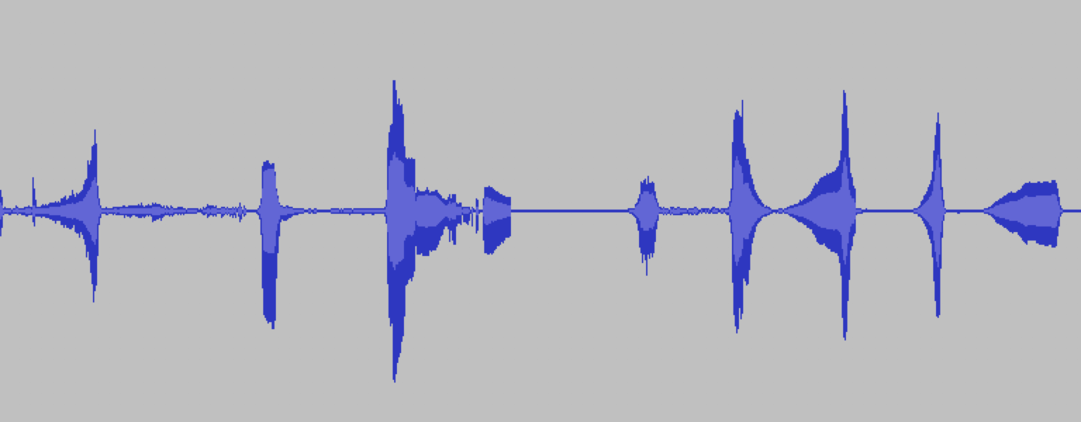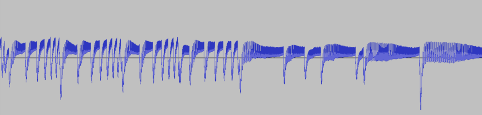 The waveform clearly shows the change from a texture (ramps up roughly seven impulses), to a more rhythmical section, jumping back and forth between longer and shorter tonal stabs: