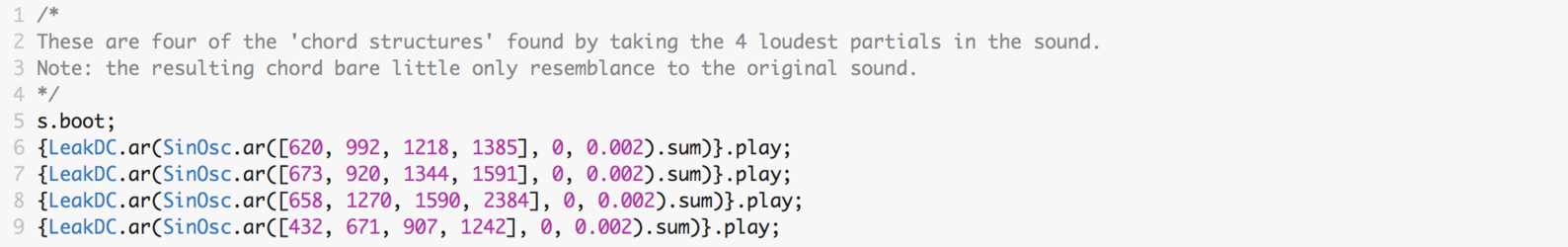 SuperCollider code showing the four loudest frequency partials of the chord structures (listed in the square brackets [] in hertz).