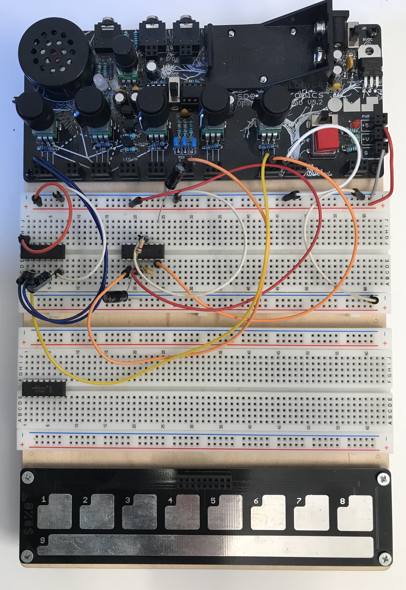 There is something entirely unintuitive, yet captivating, about the proposition that chaotic behaviors emerge when only three point-masses are trying to lock into orbit with one another. Here, complexity arises from a humble starting point. This notion pointed me to the idea of developing a synthesizer based on only three oscillators, each having an effect on the operation of the others. By keeping the elements as simple as possible, it became feasible to realize this concept using only analog electronic circuits. Up until this point, my experience with the design of analog electronics was mostly related to circuit bending and the occasional work of connecting sensors to microcontrollers such as the Arduino. However, a few months before starting the research, my interest in designing analog circuits was ignited through the purchase of an OMSynth, a circuit development and performance interface created by the artist and instrument designer Peter Edwards. The OMSynth consists of two rows of breadboards, and a circuit board on top that makes it much easier to power prototype circuits and to listen in on the sonic output of the electronic voltages.