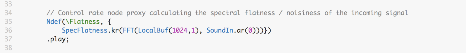 SuperCollider code showing the "Ndef" used for calculating the "Spectral Flatness" of the incoming signal. The outcoming values range between 0.0 (sinusoid) and 1.0 (noise). In SuperCollider, Ndefs can be used directly inside of other Ndefs, making it easy to rescale and map the sound analysis onto various parameters within the code.