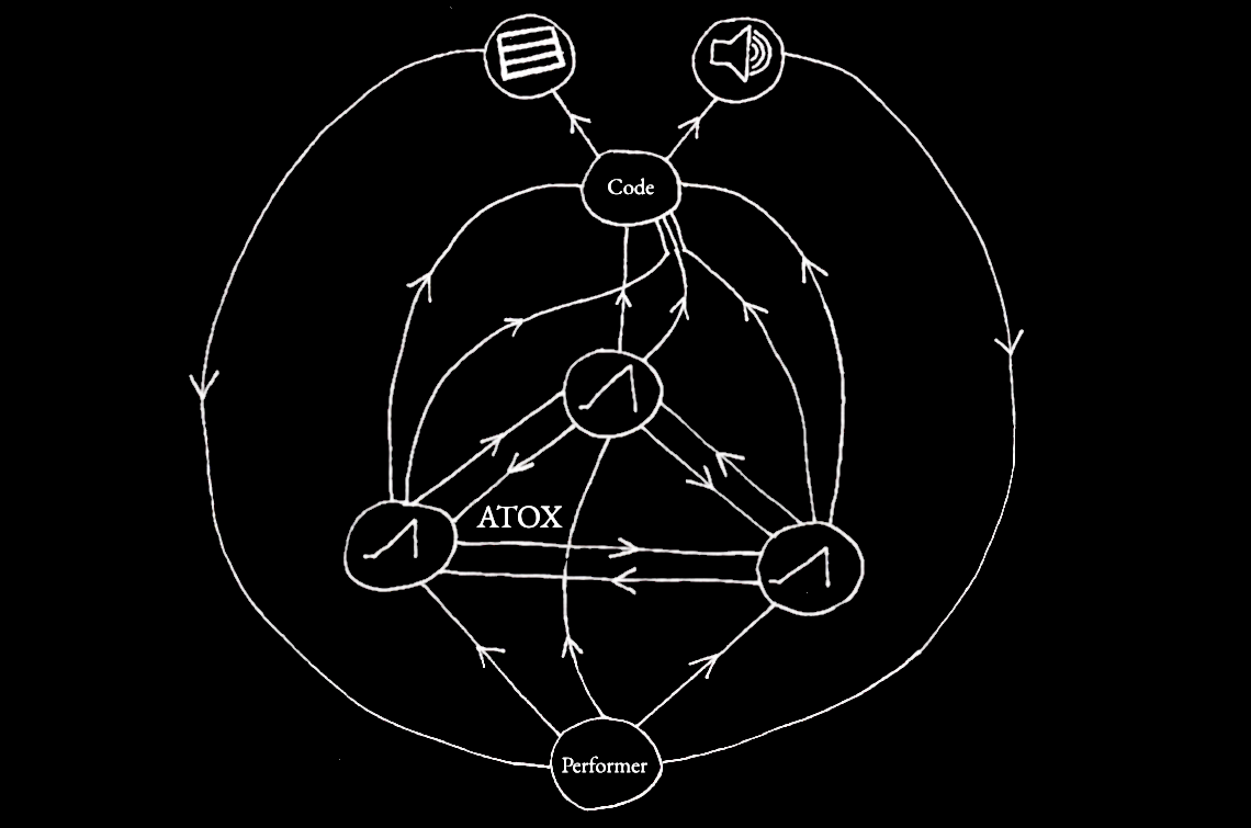 A schematic of the full instrumental setup including the ATOX synthesizer, code, sound, and visuals.