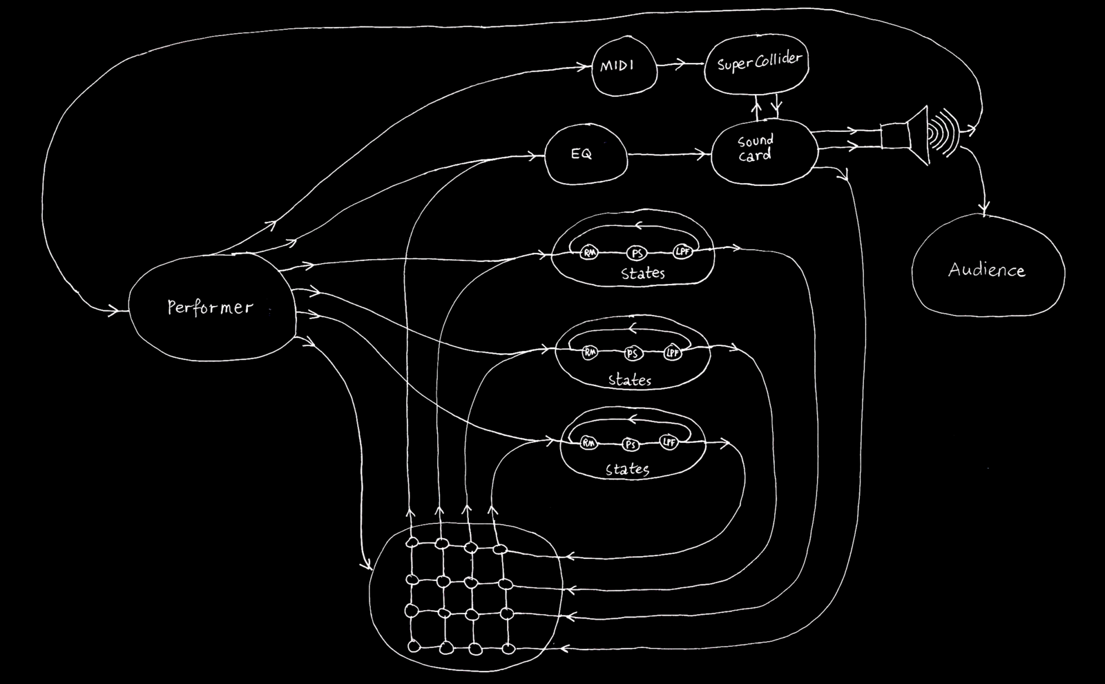 Unfortunately, after several years of extensive use, my Bitrman unit broke down. As the product was discontinued, I decided to replicate the effects chain in SuperCollider code instead. Although it proved difficult to really approximate the earlier vocabulary of sounds, a similar but different sonic universe revealed itself instead. This second version, combining analog no-input mixing with the effects-chain in SuperCollider, led to a performance titled, "STATES." The title refers to the performance practice that is used when the instrument is played. The instrument is influenced until it reaches a state in which it produces intriguing sonic behaviors. Then, the instrument is left to play unimpeded for some time. These states have musical qualities that evoke an enchanting sense of wonder.This sense of wonder arises through the perplexing behaviors of the chaotic processes, capable of creating all manner of expressive sounds that move me. When the state runs its course, the performer may decide to intervene again, informed by this wonder, influencing the behaviors of the instrument into different states. This cycle of playing and listening continues until the end of the performance. The back and forth between actively playing and deep listening is a method of performance that is recurrent in my work. It creates a structure for performances, and at the same time, communicates to the audience that the instrument has the capacity to play by itself.