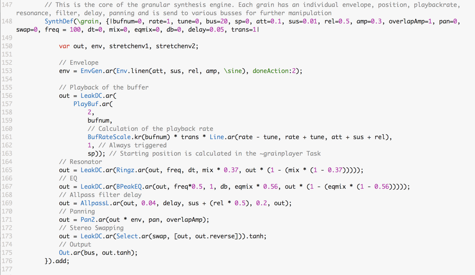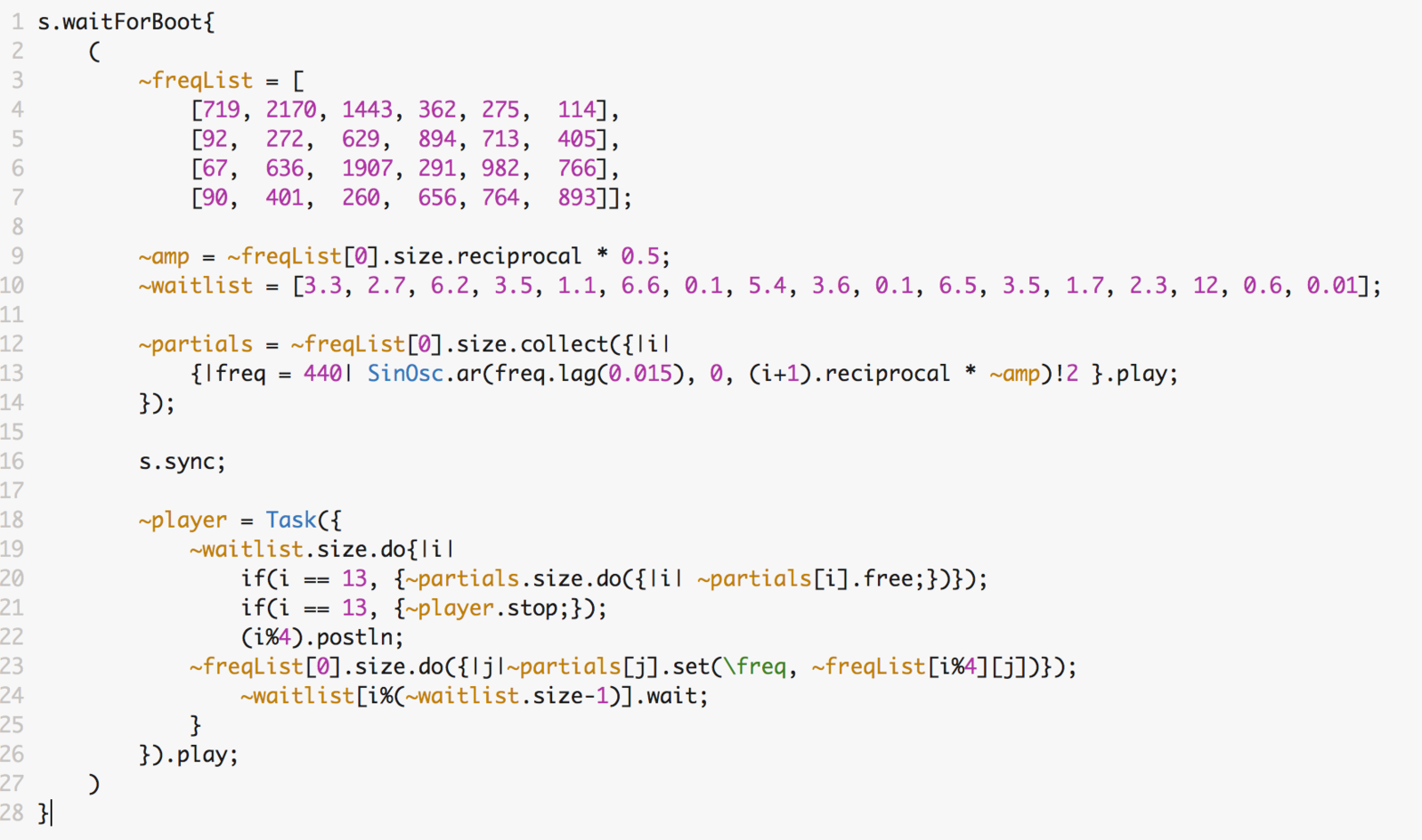 The sequence repeats roughly four times in total, although the timing of each round varies greatly. After analyzing the strongest partials in the spectrum of the recording, it is now possible to reconstruct this passage using additive sine tones in SuperCollider.