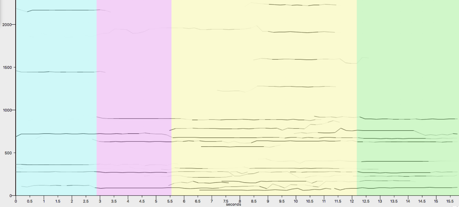 This recording features intriguing transitions from one pitch to the other. Zooming in further on only a fragment of the recording, it becomes clear that the frequencies of the different pitches partially overlap.