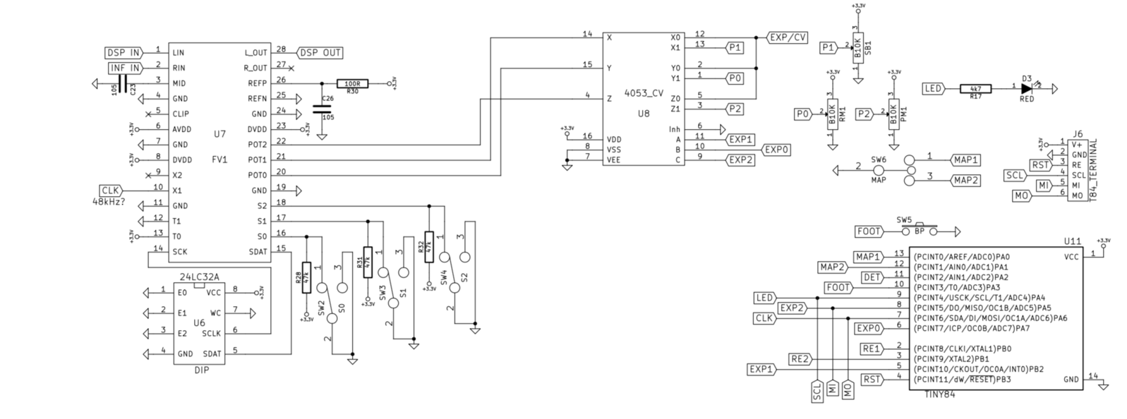Excerpt of the schematic of the STATES pedal showing the FV-1 on the left, along with adjacent circuitry.