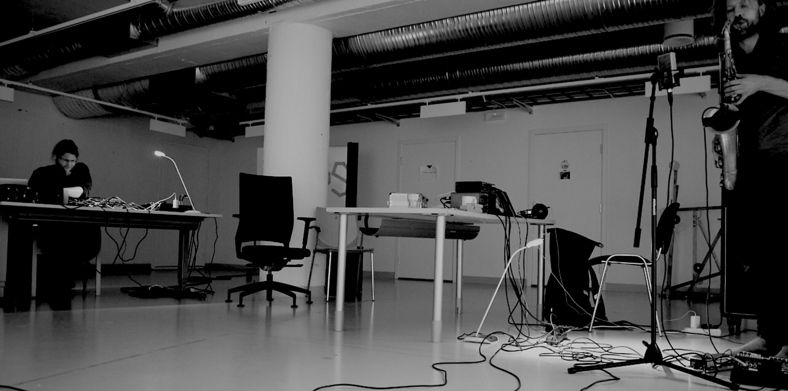 In October 2020, Kjetil and I spent a week in a studio at the University, spending the days recording improvisation sessions and conversations about our practices. We started on Monday, spending a good portion of the day setting up our gear, finding a balance between Kjetil's amplified saxophone and both of our electronic setups. Soundchecks like these can be quite labor intensive, as it is unclear how loud and how quiet the sound might turn out to become. We ended up recording two sessions, mostly testing the levels in preparation for the days to come. The next day we arrived early, everything was ready to go, and we decided to record our sessions straight away.