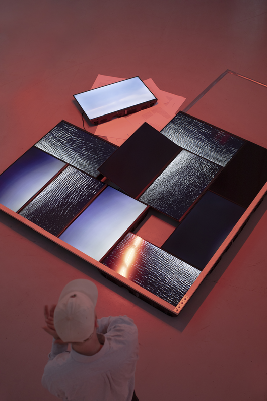 In Every abyss is a poem yet unfinished (Zanotello 2022d), the abyssal movements of time in relation to loss are made present through the diffraction of contemplative moments. The installation is activated by a reading performance where the artist, in mourning, sits and reads a text. Placed on the floor, audio-visual recordings of days turning to night and the multidirectional flow of water are arranged in an open grid of uneven orientation, creating edges and breaks where one would expect continuity, forming a movement of time that is multiple and dislocated. In the corner, the recording of an afterglow is surrounded by broken texts, unfinished essays, and poetic accounts taken from my personal research journal (fragments that are partially presented in this exposition in the afterglow's color). Reflected on the surfaces of the screens, a line of light shines through time in the afterglow of what is left of a poem, long after the words have gone and affect lingers. The warming light can be understood as a durational object activated by the performance of one of such texts. In the above video documentation, a part of That Which Stays (Zanotello 2022e) is heard. The artist attempts to cross the ineffability of the abyss by diffracting light, text, and voice upon an archive of his memories. As he reads, the intensity of his voice is translated into the intensity of the light and the heat it generates, touching the audience’s skin from afar. Once the reading is finished, the line of light repeats the pattern, rhythm, and intensity of his voice through the duration of the exhibition, thus alluding to a memory of something past that persists vibrantly in the present.