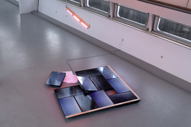 In Every abyss is a poem yet unfinished (Zanotello 2022d), the abyssal movements of time in relation to loss are made present through the diffraction of contemplative moments. The installation is activated by a reading performance where the artist, in mourning, sits and reads a text. Placed on the floor, audio-visual recordings of days turning to night and the multidirectional flow of water are arranged in an open grid of uneven orientation, creating edges and breaks where one would expect continuity, forming a movement of time that is multiple and dislocated. In the corner, the recording of an afterglow is surrounded by broken texts, unfinished essays, and poetic accounts taken from my personal research journal (fragments that are partially presented in this exposition in the afterglow's color). Reflected on the surfaces of the screens, a line of light shines through time in the afterglow of what is left of a poem, long after the words have gone and affect lingers. The warming light can be understood as a durational object activated by the performance of one of such texts. In the above video documentation, a part of That Which Stays (Zanotello 2022e) is heard. The artist attempts to cross the ineffability of the abyss by diffracting light, text, and voice upon an archive of his memories. As he reads, the intensity of his voice is translated into the intensity of the light and the heat it generates, touching the audience’s skin from afar. Once the reading is finished, the line of light repeats the pattern, rhythm, and intensity of his voice through the duration of the exhibition, thus alluding to a memory of something past that persists vibrantly in the present.