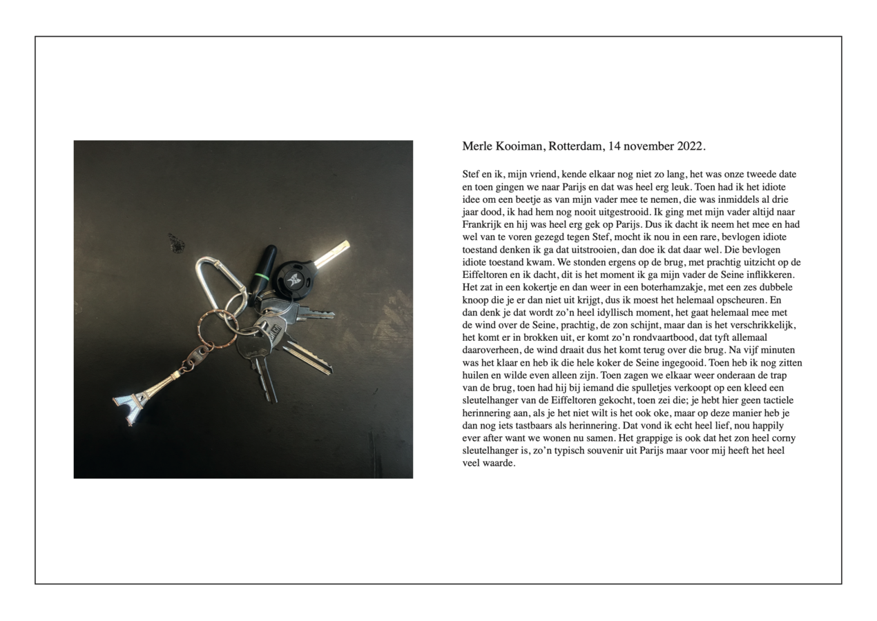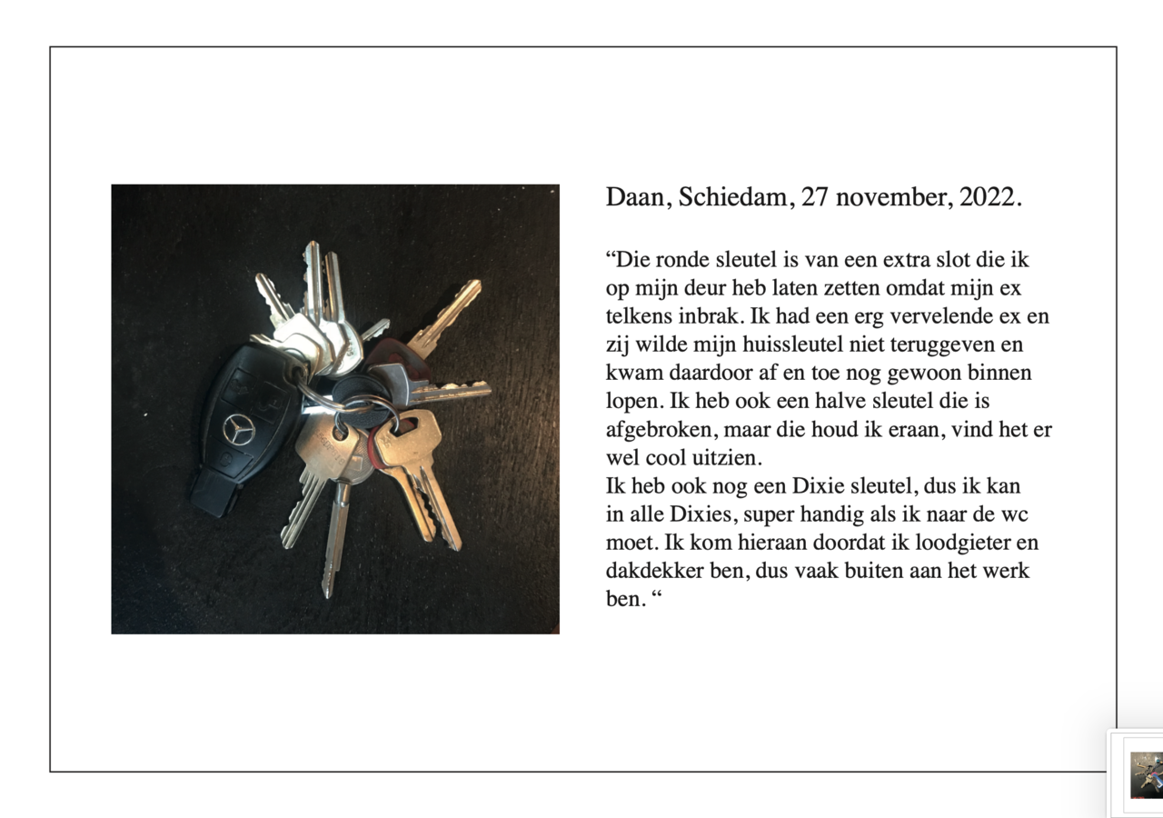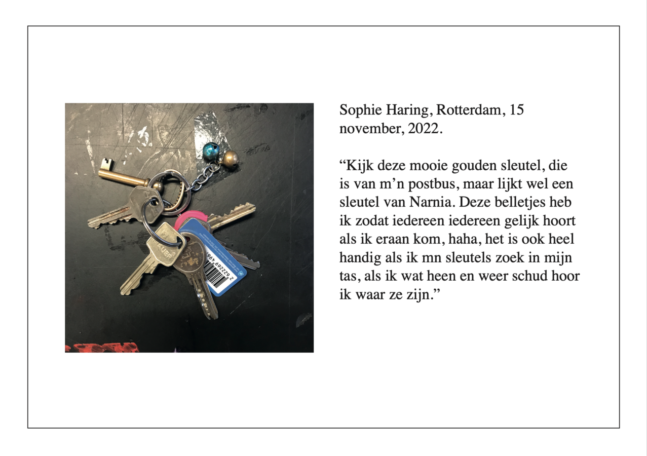 Voor deze onderzoeksmethode heb ik mensen gevraagd verhalen te vertellen aan de hand van de objecten die aan hun sleutelbos hangt.