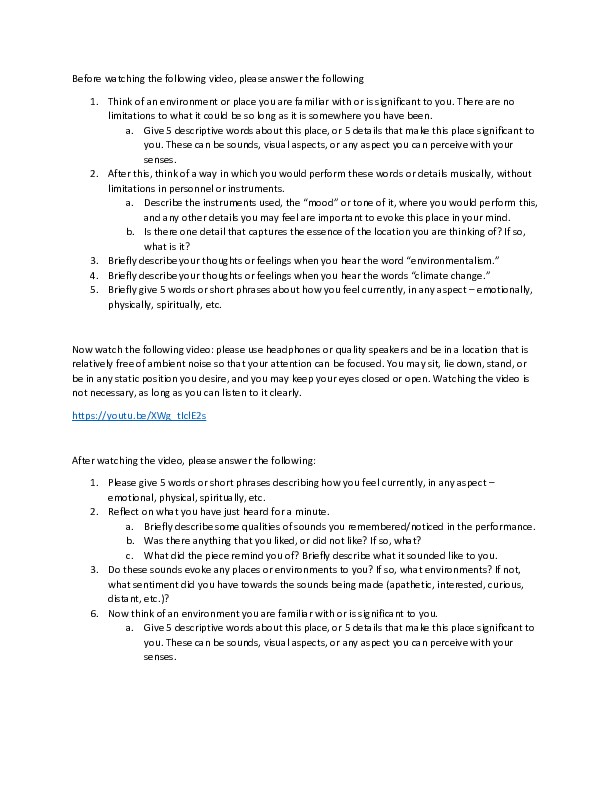In order to understand what effect this may have on a performance, I conducted a survey of individuals to see if hearing these sounds would affect the kinds of environments people imagined when prompted, without knowing the sounds were completely plant materials. Below is the prompt used.