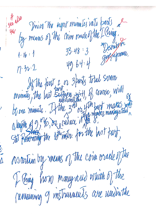 Below you can see the score itself describing the method of splitting the 8-minute piece into sections by means of the I Ching coin oracle, which Cage uses to introduce aleatoric elements into the performance. Therefore, the result of this preparation is vast in opportunity for creativity in performance. He requests the instruments to be split between the now-created sections of the piece which again come from the I Ching coin oracle.