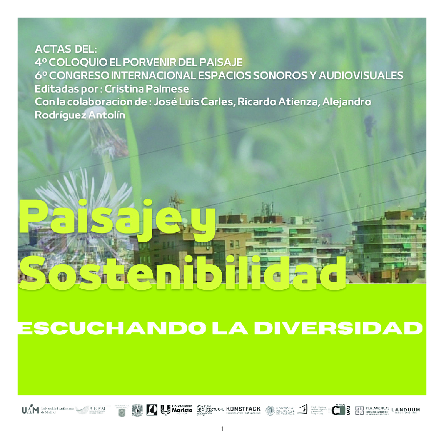 Esta exposición es un portal a los materiales presentados en el 4° Congreso de Paisaje y Sostenibilidad, Escuchando la Diversidad, y el 6° Congreso Internacional de Espacios Sonoros y Audiovisuales, que tuvieron lugar conjuntamente en Madrid, España, del 13 al 19 de Octubre de 2022. Los encuentros fueron albergados en los centros culturales La Corrala (Universidad Autónoma de Madrid) y Matadero, así como en el Auditorio 400 del museo Reina Sofía. ----------- This exhibition is a Portal to the materials presented in the 4th Congress of Landscape and Sustainability, Listening to Diversity, and the 6th International Congress on Sound and Audiovisual Spaces, which took place in Madrid, Spain, 13th-19th October 2022. These encounters were hosted in the Cultural Centers La Corrala (Universidad Autónoma de Madrid) and Matadero, as well as in Auditorio 400, Reina Sofía museum.