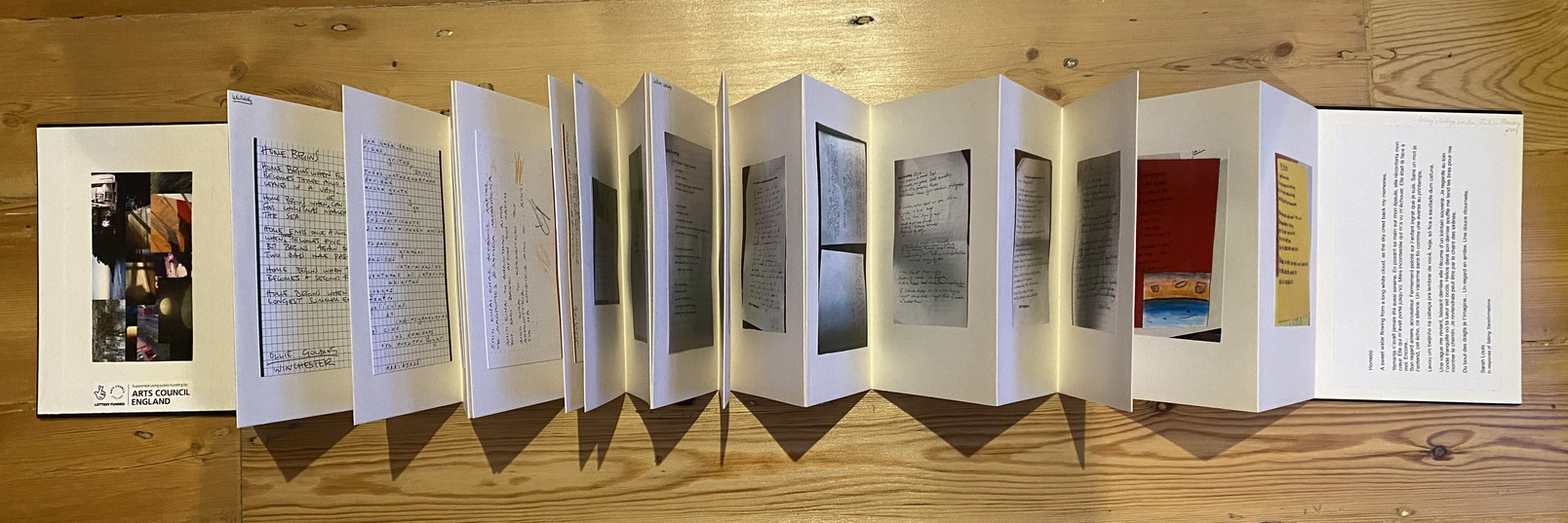 The image shows a concertina book full of poems which were created by participants of the translation workshops we led as part of the travelling exhibition. A selection of these poems is included in our anthology Home on the Move. Amongst these is Margaret Adkins' "Home", which you can also listen to here.