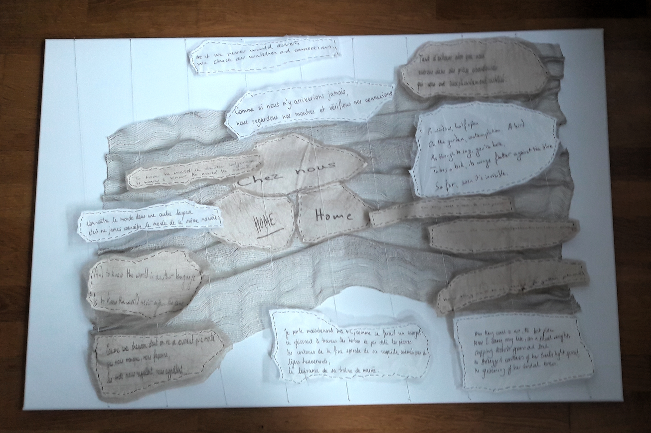 In addition to her linguistic translation, Elise Aru also made a textile translation of "Home", for which she used Deryn's poem, her own and Timothy Mathews' literary translations, weaving and stitching a delicate patchwork home from the three voices.