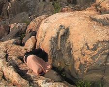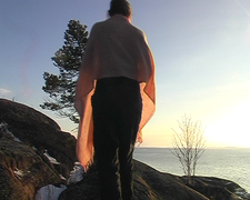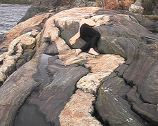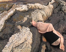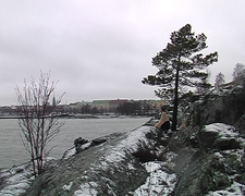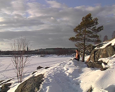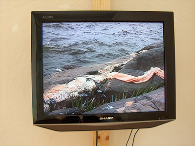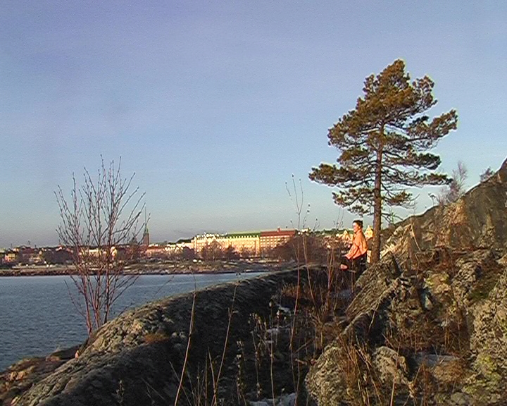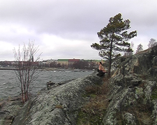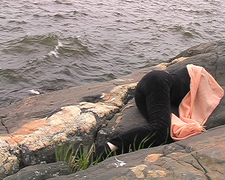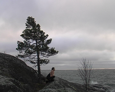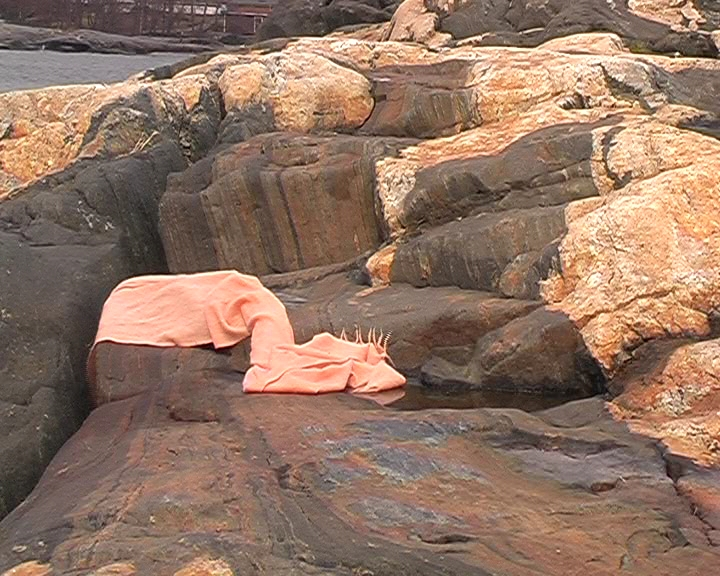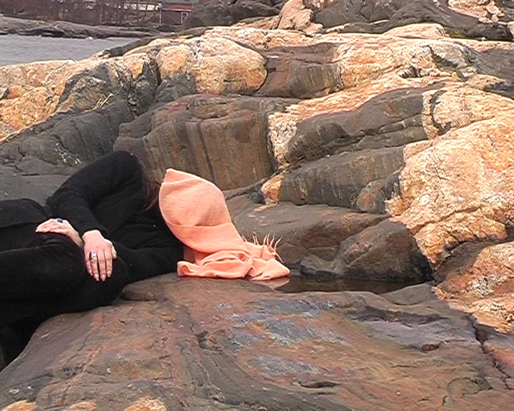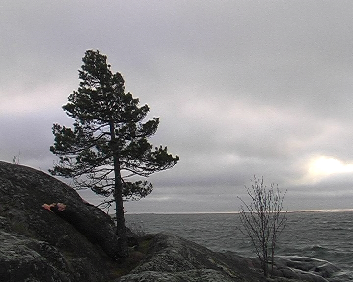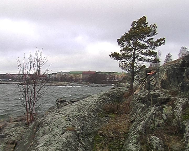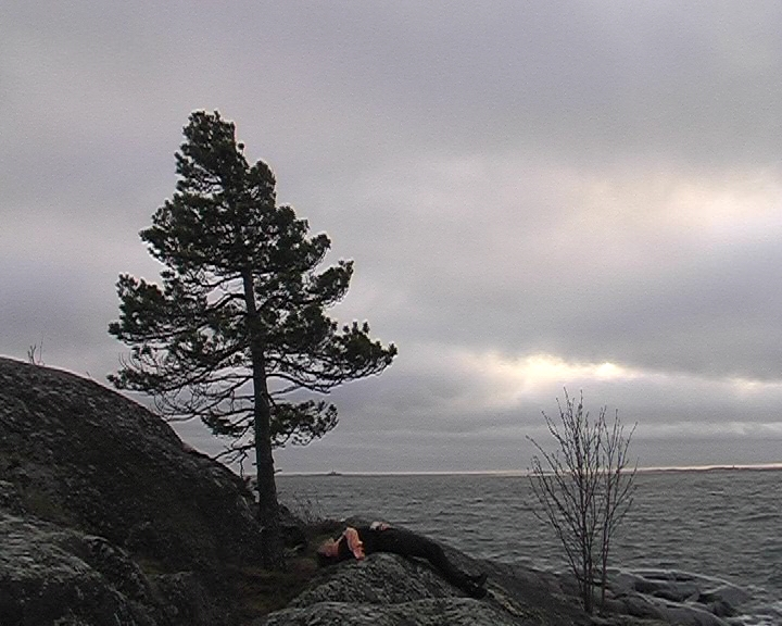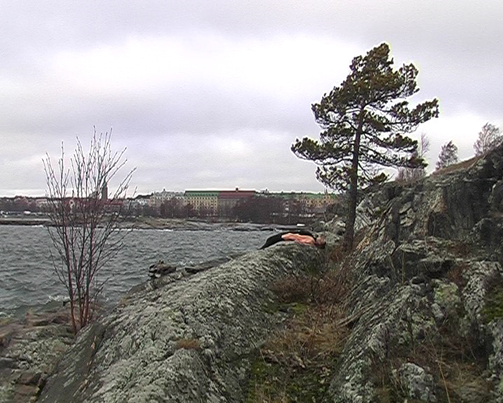 Part I. I am lying with a yellowish scarf on my shoulders on the rock below a pine tree on the western shore of Harakka island, with the camera directed towards the city in the North, 51 times, approximately once a week 7.11..2006 – 11.2.2007. Part II. I am lying with a yellowish scarf on my shoulders on the rock below a pine tree on the western shore of Harakka island, with the camera directed towards the sea in the South, 51 times, approximately once a week 7.11..2006 – 11.2.2007. Part III. I am lying with a yellowish scarf on my shoulders on the rock next to a pine tree on the western shore of Harakka island, with the camera directed towards the city in the North, on the same occasions. Part IV. I am lying with a yellowish scarf on my shoulders on the rock next to a pine tree on the western shore of Harakka island, with the camera directed towards the sea in the South, on the same occasions.