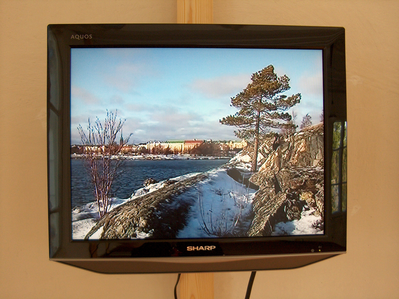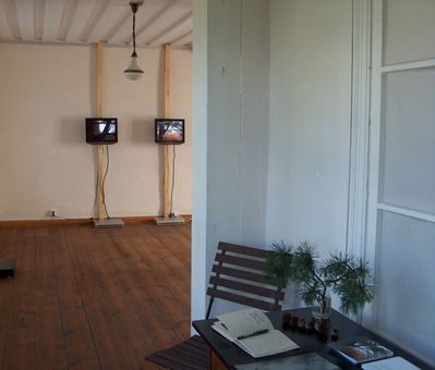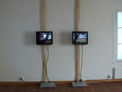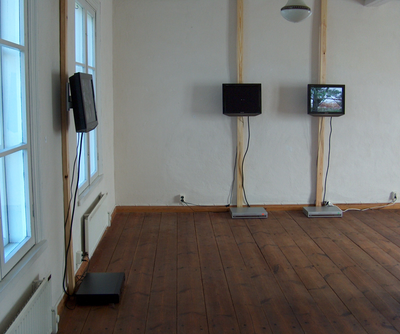 Installation for two projectors or monitors, part 1 to the left, part 2 to the right (loop).