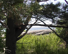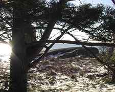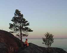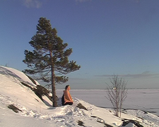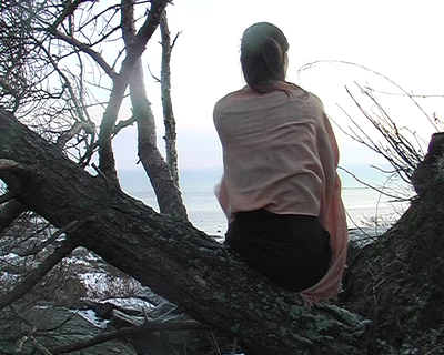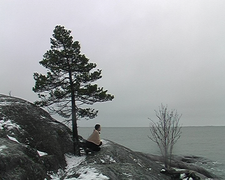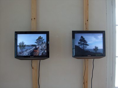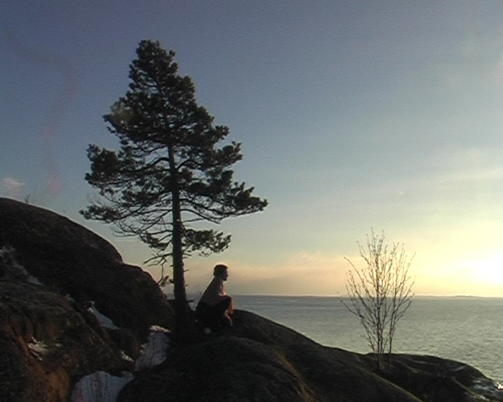 Shadow of a Pine I. I sit with a yellowish scarf on my shoulders on the rock below a pine tree on the western shore of Harakka island, with the camera directed towards the city in the North, 51 times, approximately once a week 7.11..2006 – 11.2.2007. Shadow of a Pine II. I sit with a yellowish scarf on my shoulders on the rock below a pine tree on the western shore of Harakka island, with the camera directed towards the sea in the South, 51 times, approximately once a week 7.11..2006 – 11.2.2007.