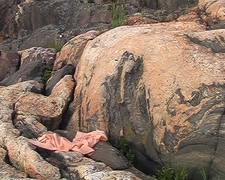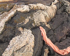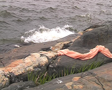 Part 1. I am lying with a yellowish scarf covering my head fourteen times on the rocks on the western shore of Harakka island. Part 2. A yellowish scarf is lying on the rocks on the western shore of Harakka island on the same occasions.