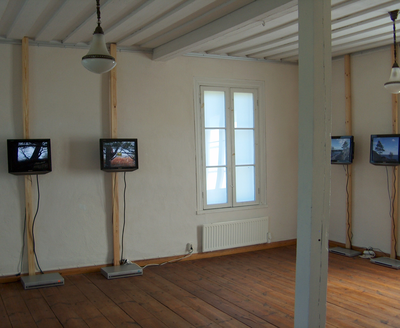 Installation for four projectors or monitors, with the pair I (left) and II (right) next to the pair III (left) and IV (right). The installation can be shown as a version for two projectors, then only parts I + II.