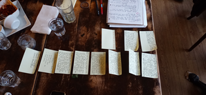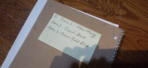 What I used for Live Experiment with dancers - GoPro Camera, a piece of black fabric for blindfold, a sound/voice recorder (missing from the picture), movement scores and sticky notes.