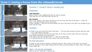- The generic scores were modified to include site-specific instructions. Investigation to site prior to installation was done so identify interesting sites and perspectives that pedestrians normally would not notice or think to ponder upon or imagine in their day to day movement through the site.