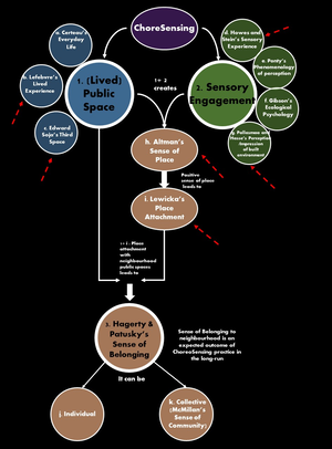‘ChoreoSensing’ (Choreo + Sensing) is an interdisciplinary practice that proposes active and immersive sensorial and embodied connection to public spaces as a means of generating and strengthening residents’ sense of belonging (Hagerty, 1992) to their neighbourhoods.