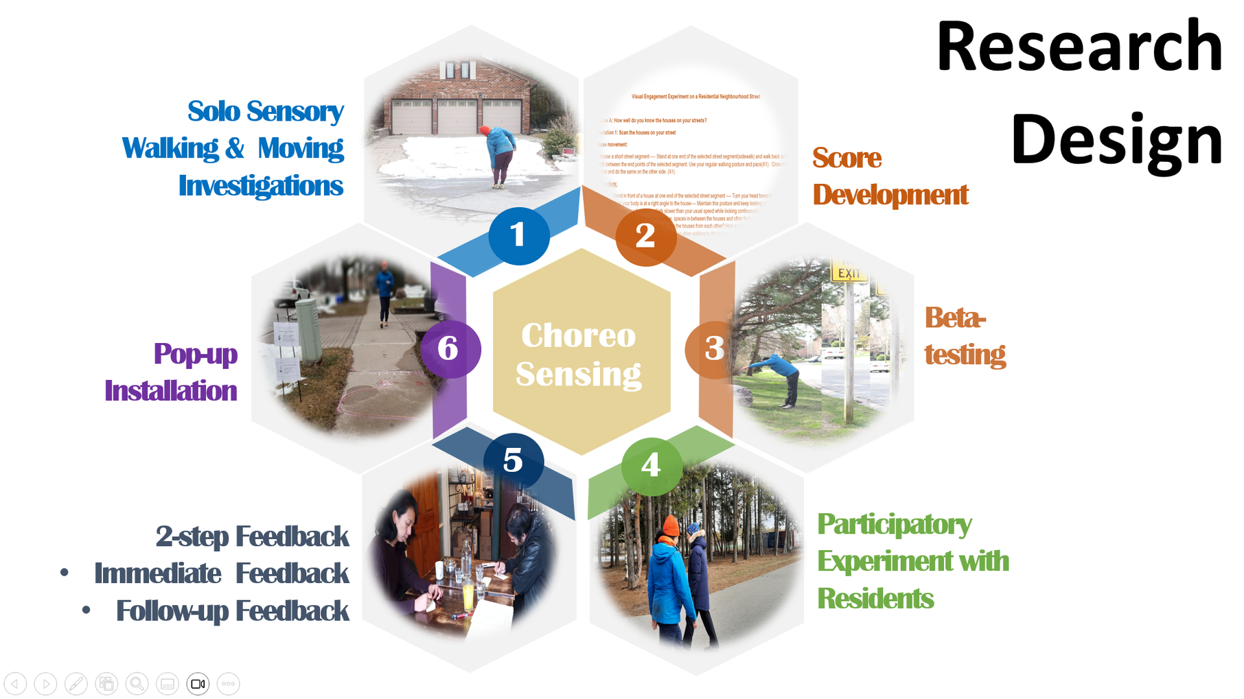 Whether it’s urban or suburban areas in cities, public spaces in residential areas are fundamental to everyday life experiences(1) which have been linked to well-being and quality of life of residents. Consciously or unconsciously, we connect with them through multi-sensory interactions (2) that create overall impressions of our neighbourhood public spaces(3,4), and help establish meaningful connections with the neighbourhood community. However, the drive for creating ‘functional cities’ (5) in the West through ‘disembodied’ practices (6) has detached public spaces from our bodies(7) , instituting the stage of mutual ‘disengagement’ as a retreat from everyday public spaces (8) and deteriorating the sense of belonging to the residential neighbourhood environment. As a result, residents either tend to avoid connecting with public spaces altogether or resemble an ‘auto-pilot’ state (9) manifested through their lack of sensory attention to public spaces– they see the surroundings but do not look, they hear the surroundings but do not listen. In this research, my aim is to devise a sensory engagement practice, which I call ‘ChoreoSensing’ (10), to (re)’engage’ residents with socio-physical dimensions of their neighbourhood public spaces. Focusing on two most dominant senses – visual and auditory - the practice attempts to establish deeper sensory and embodied engagement of residents with physical/material and social aspects of their neighbourhood public spaces. The research is conducted through interdisciplinary methods including sensory walks/movements, choreographic thinking toward pedestrian movements for sensory engagement score development, pop-up interventions (11), participatory experiments with residents and conversational form feedback (12). The purpose of my research is to empower residents to awaken their sensory engagement with neighbourhood public spaces and subsequently, enhance their sense of belonging to the neighbourhood (13,14), through a series of performative and grassroots initiatives.
