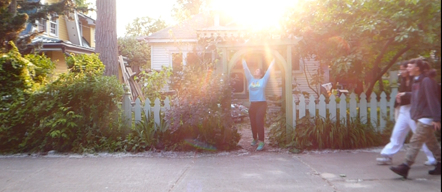 - How does this re-enactment of this action/event in relation to the street perform for you through the frame?