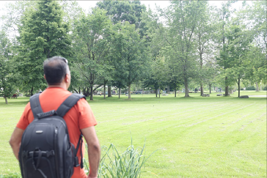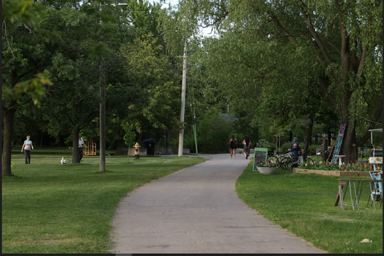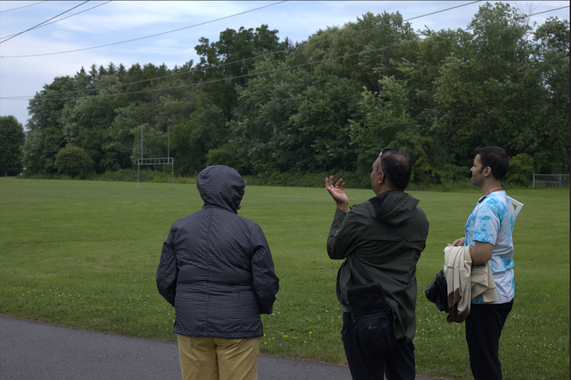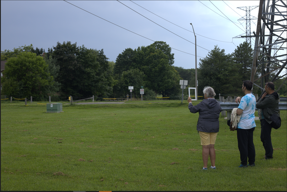 Although the score asked them to explore the social life at the site, participants seemed more interested in exploring the natural environment of the park. They looked at the green willow tree in front of them on one side of the park, the Hydro Poles and the expansive field on another side, the houses on Liverpool road and the high school on their final side of viewing. Because of the weekend and summer holidays, participants mentioned that they did not notice much social activities around. They noticed a few children riding their bikes, a middle-aged man riding his skateboard and a highschool student learning to drive. Those were the only social activities that they identified. The other activities that interested them were the construction site at the schoolyard and the backyard of a large old house right next to the park.
