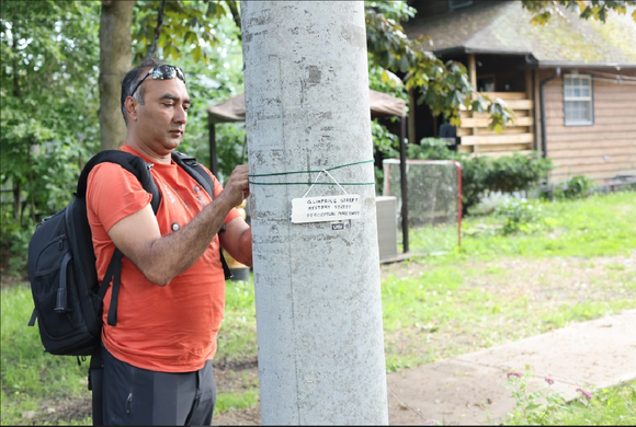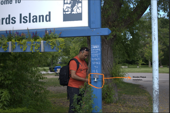 Image 36: Participant leaving the intervention at the site. The wooden plaque contains the 3 new names the participant gave to 'Third Street' based on his exploration of perceptual innuendos.