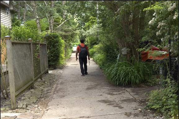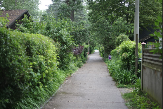I conducted the exploration through sensory walking and improvisationally moving through the residential streets while focusing on sight as the primary sensory input receptor in this case. I began walking and moving from the intersection of Fourth Street and Channel Avenue. The movement was not planned ahead of time. It was improvised but slow. The only thing that was planned was my intention to visually explore and engage with the perceptual innuendo, unexpectedness and whimsy of the streetscapes. Just after a little bit, it became clear that the street section starting from Fourth and Channel and ending at Fifth and Bayview offered an amazing opportunity of perceptual innuendos of the built environment. So, that visual quality of the built environment became my interest for exploration. As my body moved, my gaze moved with it which allowed me to explore the streetscape from various visual perspectives. During the activity, I responded spontaneously to my impulses and walked or moved accordingly. Three different physical modalities were employed in this exploration - the visual perspective from the standing height (of an adult), the visual perspective from the crawling position (assuming the perspective of a child) and visual the perspective from a curious moving body (such as dancers, movement practitioners).