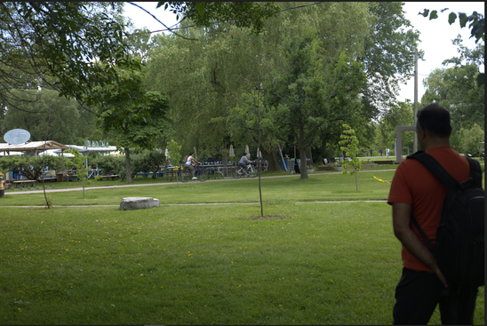 On the side of the park where there is a cafe, the participant noticed people walking in and out of it with either drinks or some other small paper bags (possibly some snacks in them) in their hands. Some customers stayed inside the cafe. He also noticed different types of service vehicles on the roads next to the cafe.