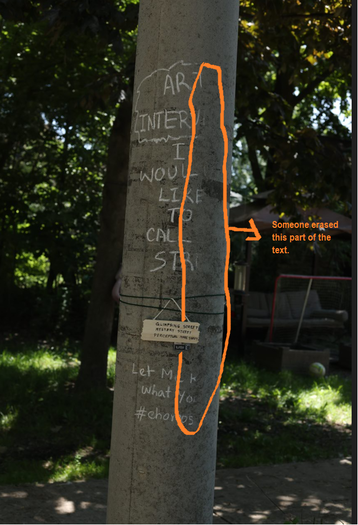 Image 37-38: Public interaction with the intervention. Next day, when I went to visit the intervention site, I found Someone erased part of the written text. It suggested public interaction with the intervention. The motive behind the interaction was not clear to me.
