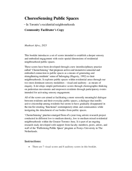 This booklet contains the visual and auditory scores developed between September 2022 and July 2023 as part of my public space research project at Fontys University, The Netherlands. The scores are designed for residents and to be used in group activities facilitated by community facilitators. The intentions of the scores are not different from those in the 'Resident's Copy' but the instructions have been edited to support activities in group participation settings as opposed to in solo participations.