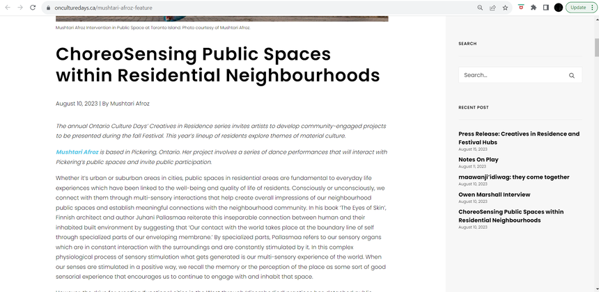 - Ontario Culture Days Festival is a province-wide art festival organized annually in Fall. The festival runs for a month between September and October and features artworks, workshops, performances, book launches, art talks by artists from the province of Ontario. Since 2021, the festival has started a creative-in-residence program for which it selects 6-8 artists through an Open Call to create exciting new works for the season. For its 2022-2023 season, I am one of these 6 creatives and have been commissioned to create a public space-focused choreographic work.