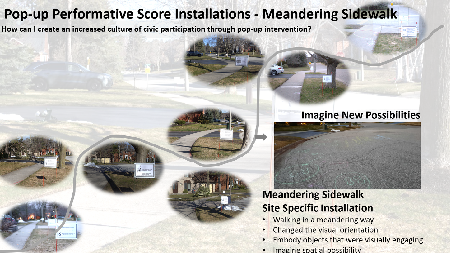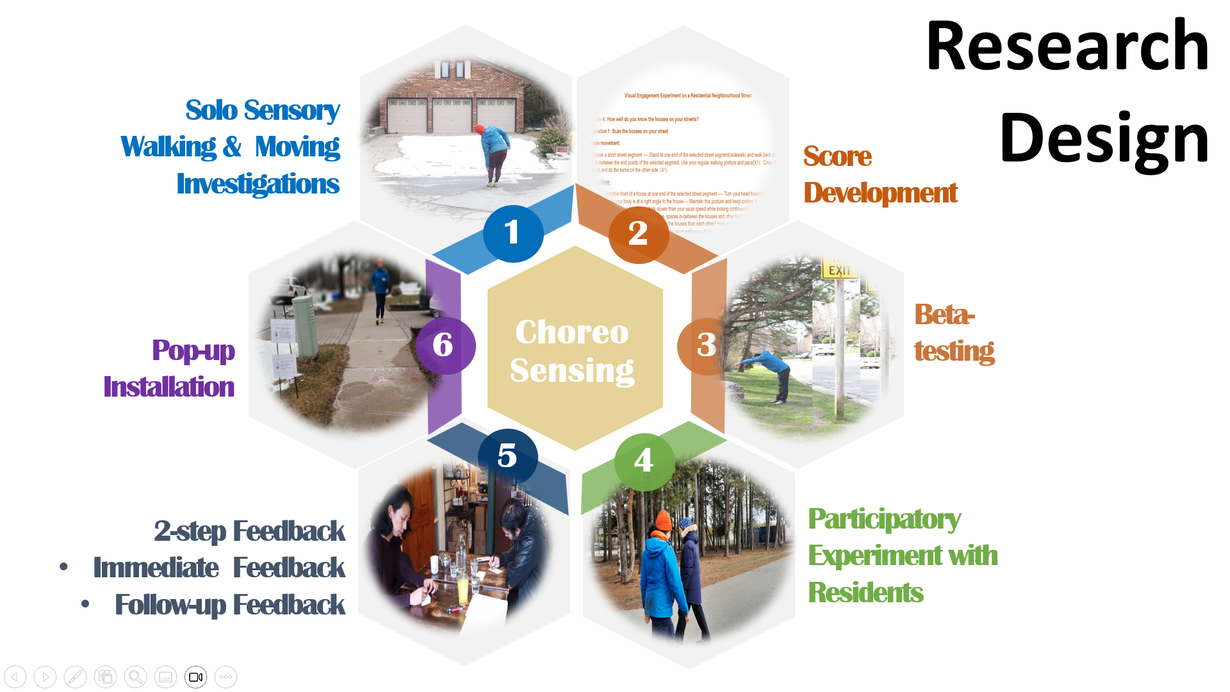 Keywords: residential neighbourhood public spaces, multi-sensory engagement, performative scores, disembodied vision, environmental soundscape, social soundscape, pedestrian movements, postmodern choreography, participatory practice, tactical urbanism, performative score installations, sense of neighbourhood belonging