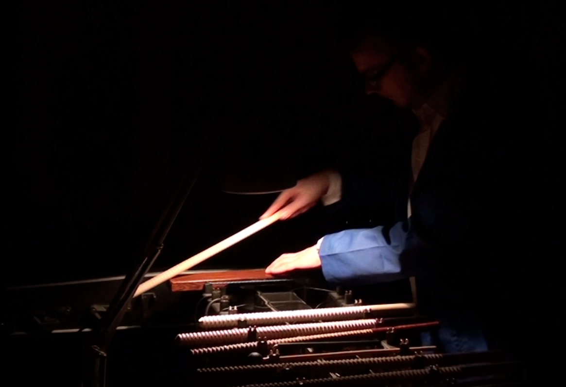 Concert at the Vinterlyd Festival in Levinsalen at NMH, February 28th. 2011. A laboratory for percussive materials and surfaces: stone bar, metal bar, glass cymbals, marimba bar, elk-drum, wooden log, glass rod and resonance ‘tabla’. Collaboration between Kjell Tore Innervik and Ivar Frounberg – guest stars featuring Oslo Mobile Phone Orchestra (Alexander Refsum Jensenius, Eirik Sletteberg a.o.).