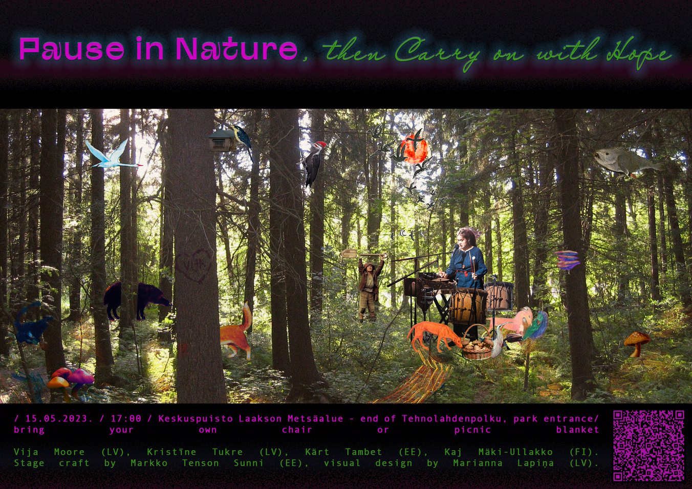 The music is a combination of my original compositions and my arranged Latvian folk songs, also keeping the duality of external and internal worlds. The folk songs have been chosen on a critique of relevance to my interpretation of returning to the present moment and local space, but processed through my emotional sense, creating my own musical interpretation. The original compositions are a straightforward reflection of my internal world's view of the external world, processing the heaviness of personally heard stories and media, which is supported by composing in the natural environment of the forest.