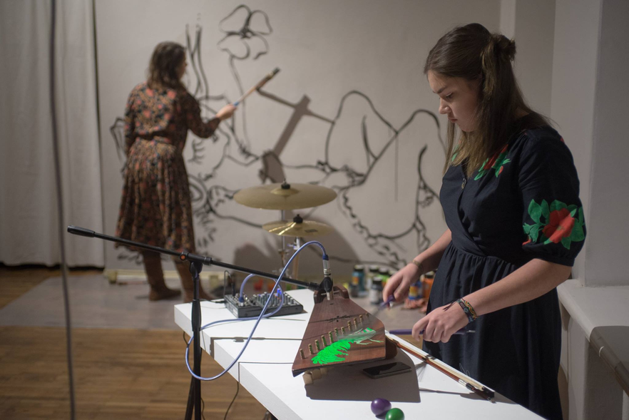 When I was 16, I did my first collaboration with visual artist Ingrīda Pičukāne, who is a well established feminist visual artist in Latvia. We did multiple collaborations about relevant topics in Latvia from a feminist standpoint with live painting and live looping improvisations with percussion, kokle, violin and other instruments I play. This introduced me to the approach of art creation about societal topics. I was surrounded by the visual art community often and enjoyed the rebellious approach to art and continued to collaborate with visual artists, nowadays as well.