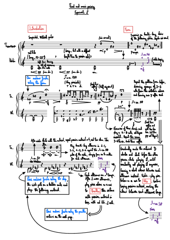 During the past decade, there has been a surge in the literature about crossmodal correspondences, consistent associations our minds establish between stimuli that are perceived through different senses. Correspondences between sound/music and flavour/taste have received particular scholarly attention, which has lead to a variety of practical applications in the form of food and music pairings, mostly examples of so-called ‘sonic seasoning’, a way to use sound to enhance or modify the tasting experience. This thesis aims to explore the pairing of food and music from an artistic perspective. Its goal is to find tools that would allow to present both music and food as components of coherent live performances in which neither of them is a mere ‘seasoning’ to the other. Through the description and exploration of different ‘mediating elements’ between them (such as crossmodal correspondences, but also structure, ritual, narrative, and others), a wide range of possibilities is presented to whoever wants to match food and music in a truly synergistic manner. Readers interested in multidisciplinary, interdisciplinary, or transdisciplinary artistic practices of any kind might find the outcomes of this research useful for their own work.