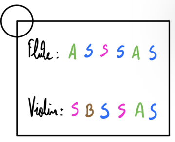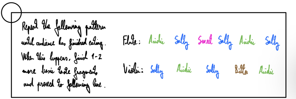 From a technical perspective, the proportion between the different musical materials was managed in a very simple way. For each of the dishes, each of the instruments was assigned certain musical gestures corresponding to each basic taste. Following the order presented in the tables below, the performers would have to repeat the materials as many times as needed until the audience had finished eating. (These tables are taken from the score for Experiment 1, which can be found in Appendix 2.)