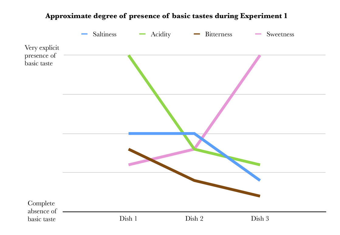 For the first experiment, I used crossmodal correspondences between basic tastes and different musical parameters to match the music and the food (this is explained in greater detail in the section Mediating elements. Crossmodal correspondences). It was important for me to have clear contrasts in both the music and between the taste of the different dishes that would be served. For this reason, I made the food considering that each dish would show a distinct balance between the four different basic tastes (umami was only considered as a balancing element when cooking these dishes, but not in the matching with the music, since it was not taken into account in the different studies on crossmodal correspondences I used as a source). A schematic representation of the approximate degree of presence of each basic taste in each dish is shown below in the graphic. The values in this graphic are depicted as continuous instead of discrete to represent how the music was meant to gradually transition from one dish to the next.