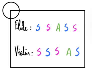 On a different level, each of the simple textures represented an increase in chewiness from the previous. The first dish was a foam, which required no chewing; the second was a chip, the crunchiness of which would require a little, but not too much, chewing; the third was a flatbread, which required quite a lot of chewing. This progression occurred in the music as well, in the sense that each musical texture presented an increased sense of a stable pulse. The music corresponding to the foam had no stable pulse at all; that corresponding to the chip established brief moments in a stable pulse for each of the instruments; finally, the music corresponding to the flatbread established a regular pulse in the violin part, which would dominate over the stable but different pulse of the flute part in this section.
