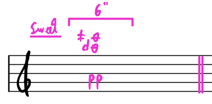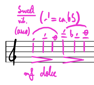 - ‘Sweet’ musical material: I decided to use two distinct musical gestures to represent the sweet taste, as I knew I wanted to have a progression from fairly little sweetness to a very pronounced degree of it during the experiment. It would first be represented by a single suspended long multiphonic on the flute, a material that would find its equivalent in the violin part as a harmonic double stop. Later in the piece, I would incorporate another 'sweet' gesture, which would more explicitly explore the qualities of "legato articulation” and “low degree of dissonance”.