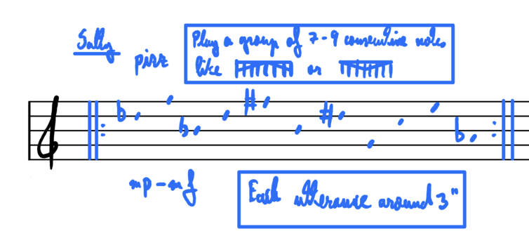 On a personal artistic level, I did not find this use of crossmodal correspondences particularly inspiring. I had to adapt my musical language to mainly take into account the musical parameters that were evaluated in the studies I consulted. Timbre, which I consider to be the starting point of my compositional thinking, was notably absent from these studies (or only present in the sense of different instruments being associated with different tastes [see Crisinel & Spence, 2010, for instance], but not the same instrument making different sounds). In this respect, studies that link other types of sound (not necessarily music) to flavour/taste might have lead to more interesting results when applied to different instrumental techniques (see Simner et al., 2010, for instance). This being said, composers who do usually take (some of) the above described musical parameters as starting points for their pieces might find this a fairly straightforward way of approaching the creation of a score that matches a particular dish.