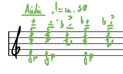 - ‘Bitter’ musical material: I decided that, since the presence of bitter taste was going to be rather low during the experiment, it would be enough to give this material to the violin and not the traverso, which had the additional advantage of the violin being able to play a perfect fifth lower and thus fit the selected pitch range more effectively. The “high degree of roughness” would this time be achieved by a strong attack of the violin on a double stop, and then a glissando that would either depart from or end in a unison, creating a strong clash between the two notes when close to the unison but not quite there.